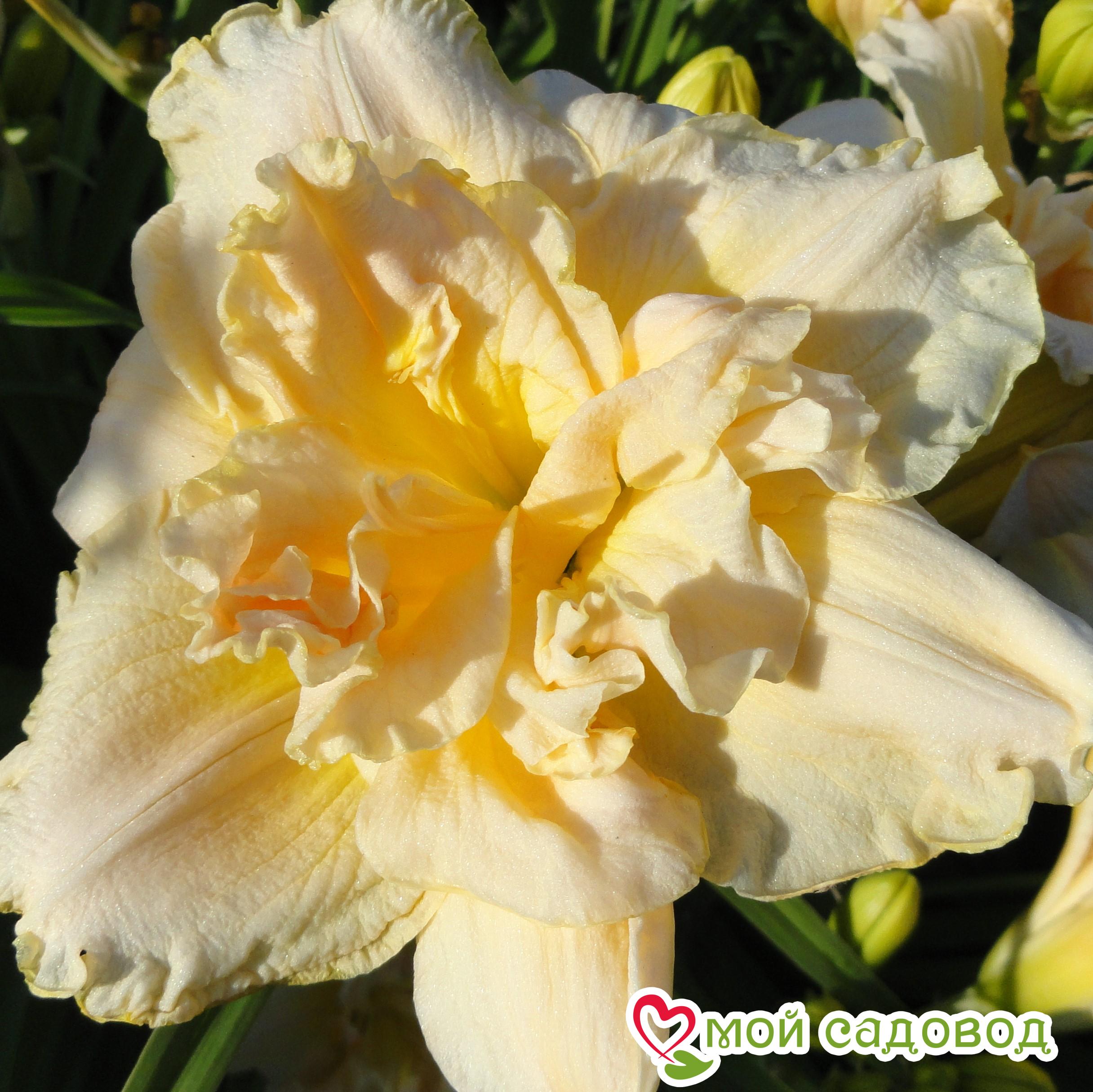Это невысокий бордюрный сорт со средними сроками цветения. За один сезон на кустах образуется по 20 – 30 цветоносов. На каждом из них появляется по 10 – 20 цветков. Бутоны махровые, с гофрированными лепестками. Окрашены они в кремово-белый цвет. Горло с зеленоватым оттенком. Сам куст компактный, но распустившиеся цветки достаточно крупные. Время непрерывного цветения длится 2 – 3 месяца. Аромат тонкий и ненавязчивый.